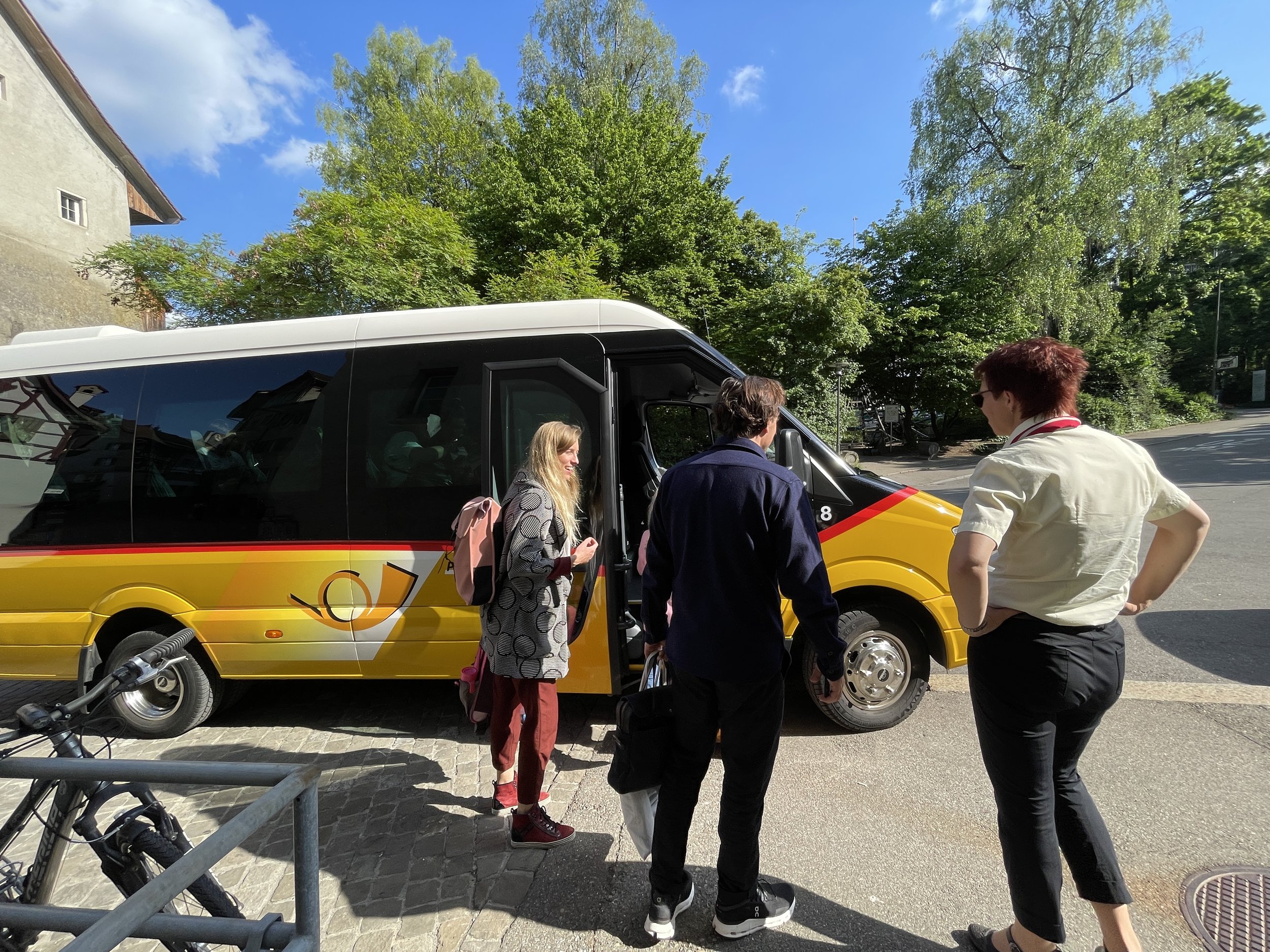 Community bus tour for the vernissage at Möriken-Wildegg Municipality on Yul Bryner Platz, Switzerland.